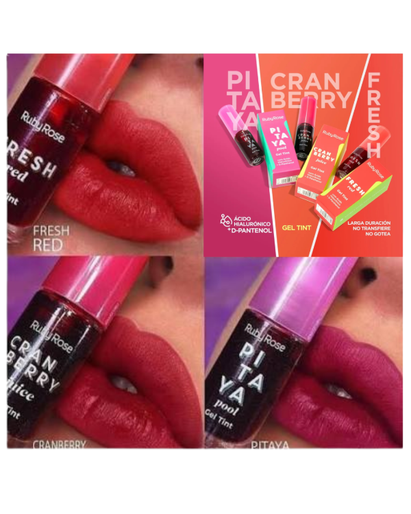 Descubre la tinta de labios Gel Tint de Ruby Rose, un producto diseñado para realzar tu belleza natural. Su fórmula enriquecida con ácido hialurónico y D-panthenol proporciona hidratación y suavidad, asegurando que tus labios luzcan frescos y saludables durante todo el día.